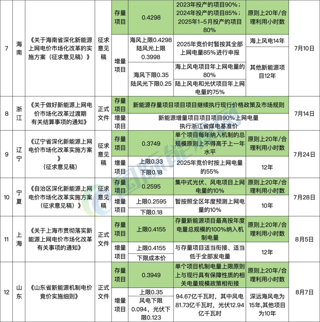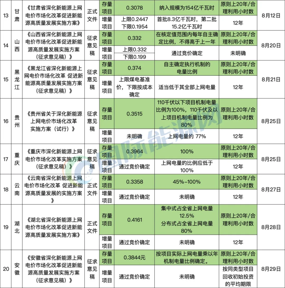 整体看,已出台文件的20个省级行政区的文件都区分了存量项目和增量项目的机制电价和机制电量的规则,存量电价基本以当地煤电价格为基准,增量项目的电价有的省份存在最低电价和最高电价的区间规则。存量电价的价格区间为0.26元——0.45元/千瓦时;增量项目电价区间在0.12-0.42元/千瓦时。