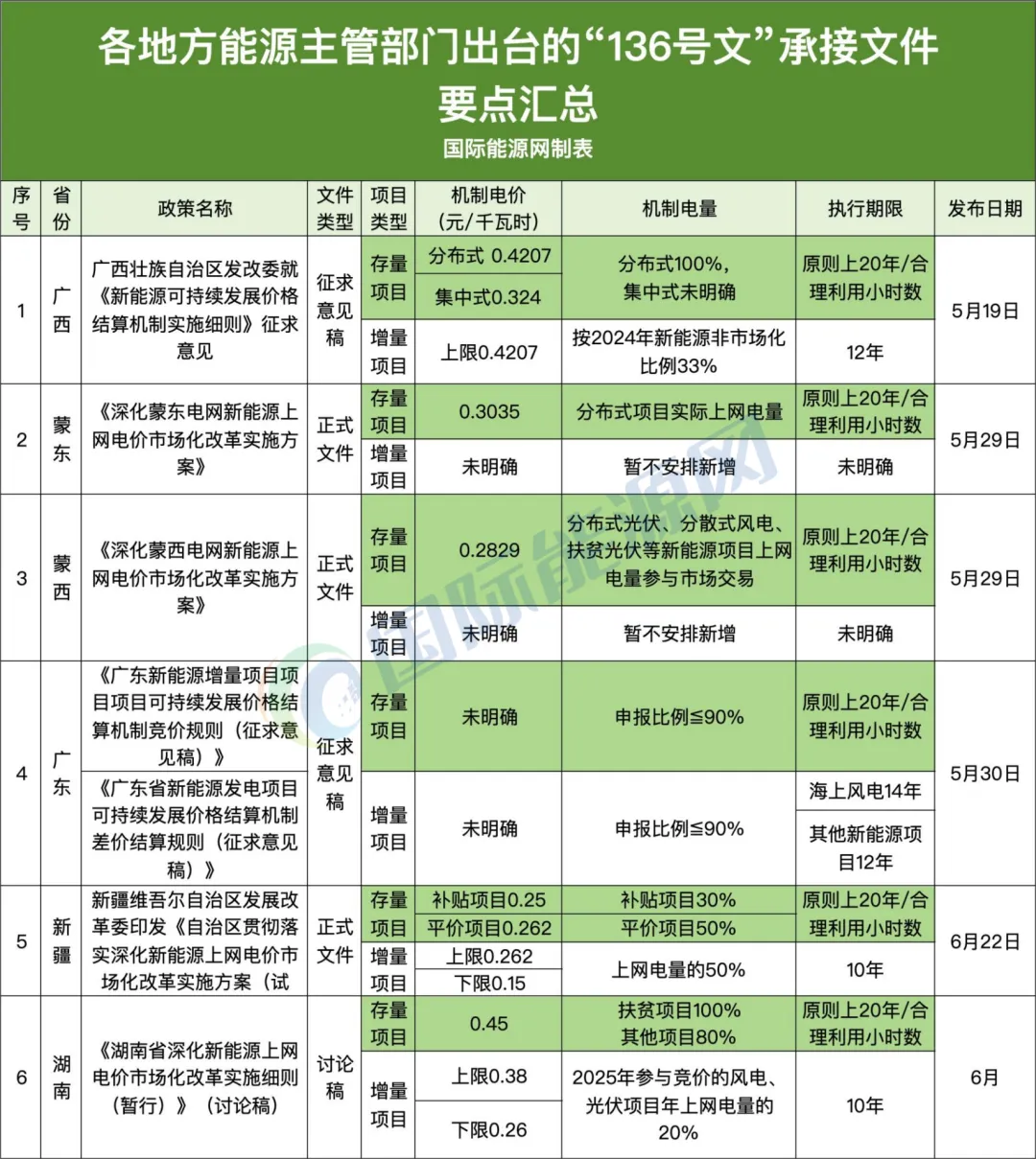 部分省区区分集中式和分布式项目的机制电量比例,仍有少数省份未能明确增量项目机制电量的规模范围。以下为国际能源网整理的政策文件汇总: